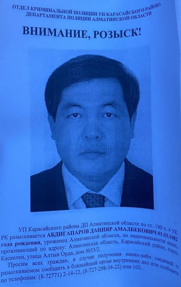 "Сотрудниками криминальной полиции объявлен в международный розыск Данияр Апдигапаров 1982 года рождения. Он подозревается в совершении преступления, предусмотренного статьей 190 Уголовного кодекса, то есть "Мошенничество", - сообщили в пресс-службе регионального ДП.