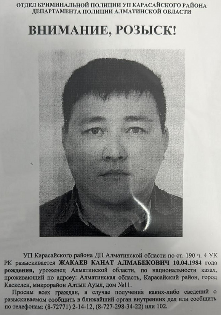 "Сотрудниками криминальной полиции объявлен в международный розыск Канат Жакаев 1984 года рождения. Он подозревается в совершении преступления, предусмотренного статьей 190 Уголовного кодекса, то есть "Мошенничество", - отметили правоохранители.