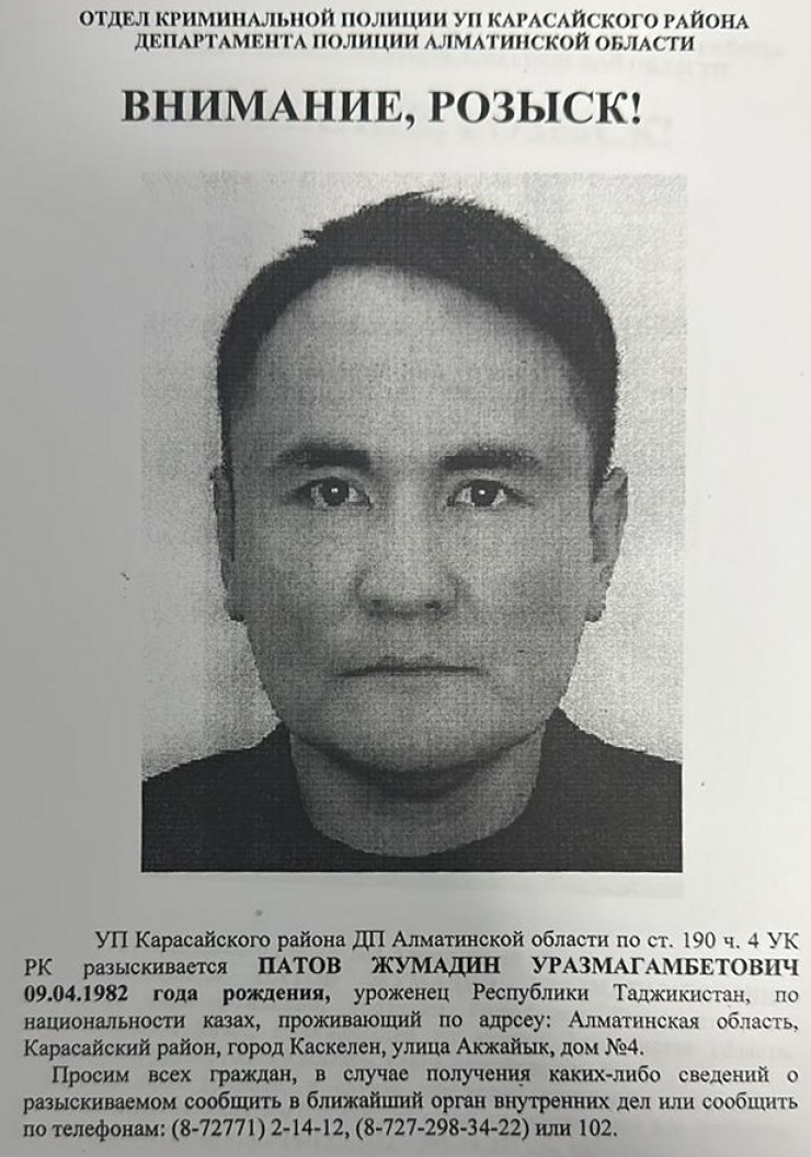 "Сотрудниками криминальной полиции объявлен в международный розыск Жумадин Патов 1982 года рождения. Он подозревается в совершении преступления, предусмотренного статьей 190 Уголовного кодекса, то есть "Мошенничество", - добавили в полиции области.