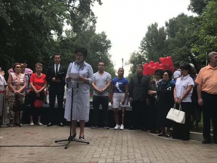 Мемориал открыли под композицию Дениса She Won't Be Mine. На церемонии присутствовали заместитель акима Алматы Арман Кырыкбаев, олимпийский чемпион по боксу Ермахан Ибраимов, тяжелоатлет Илья Ильин, народная артистка СССР Роза Рымбаева, народная артистка Казахстана Жания Аубакирова и многие другие.