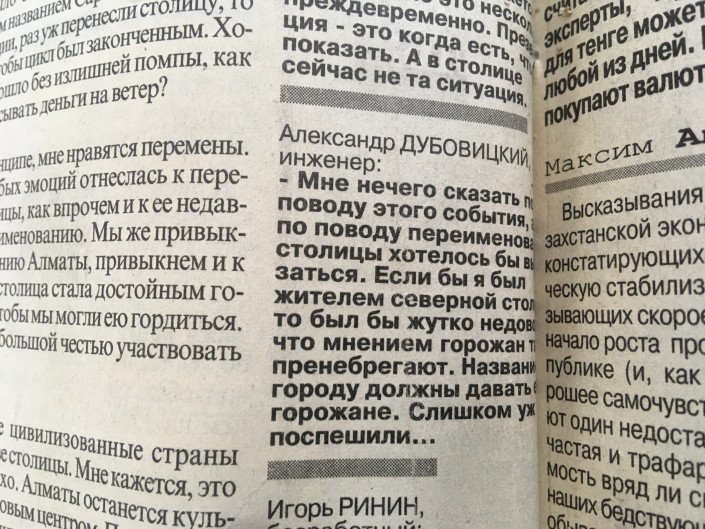 "Когда переименовали Алма-Ату в Алматы, лично мне это было неприятно. Думаю, жители столицы испытывают то же ощущение. Новое название режет слух, но ко всему можно привыкнуть", - приводит газета слова главы издательства "Баур" Бауржана Иманалиева.