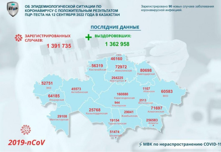 В Казахстане за прошедшие сутки (12 сентября) зарегистрировано 90 новых случаев заболевания коронавирусной инфекцией, передает Tengrinews.kz со ссылкой на МВК по нераспространению COVID-19.