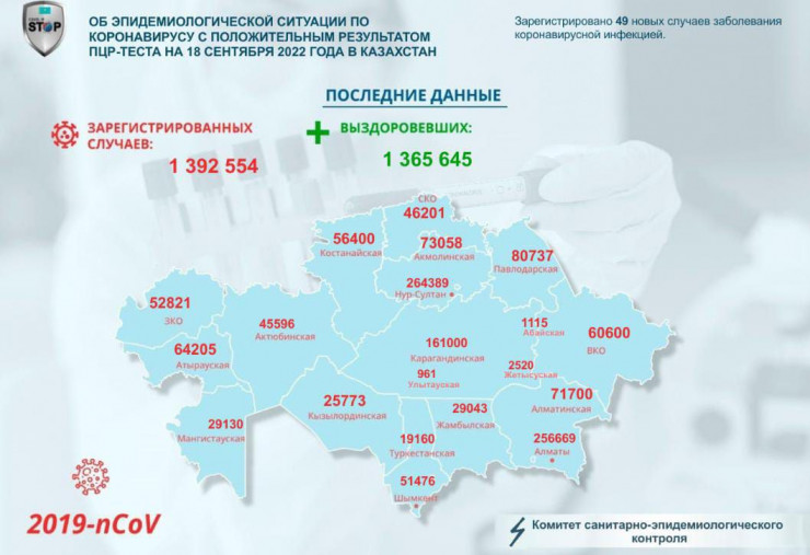 За прошедшие сутки 18 сентября было зарегистрировано 49 новых случаев заболевания коронавирусной инфекцией. Всего в стране подтверждено 1 392 554 случая, из них за сутки: