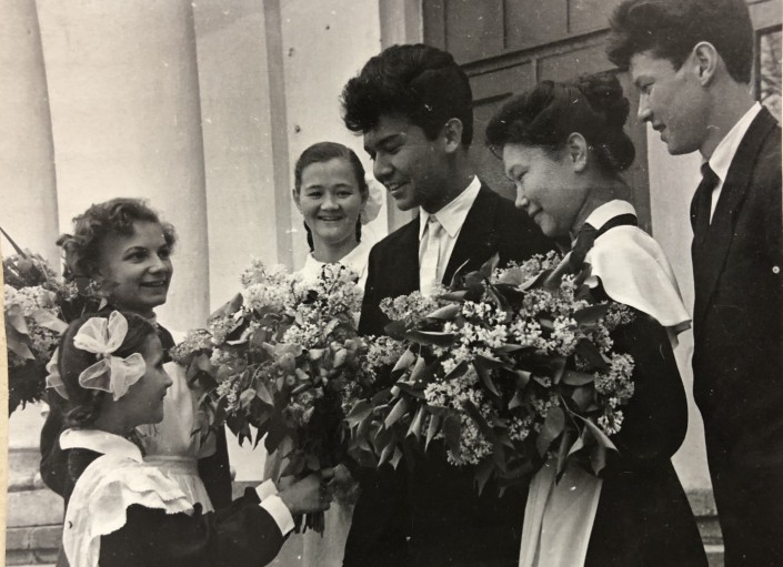 1960 год. Первоклассники школы № 28 Алма-Аты дарят цветы выпускникам. Здесь можно заметить, что изменилось "плечо" передника у ученицы младших классов. Похоже, что в этот период вошли в моду фартуки с широкими лямками в виде воланов. У парней-десятиклассников строгие классические пиджаки и галстуки.