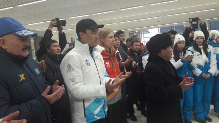 Первый казахский олимпийский чемпион Жаксылык Ушкемпиров благословил молодых казахстанских спортменов, прочитав бата.