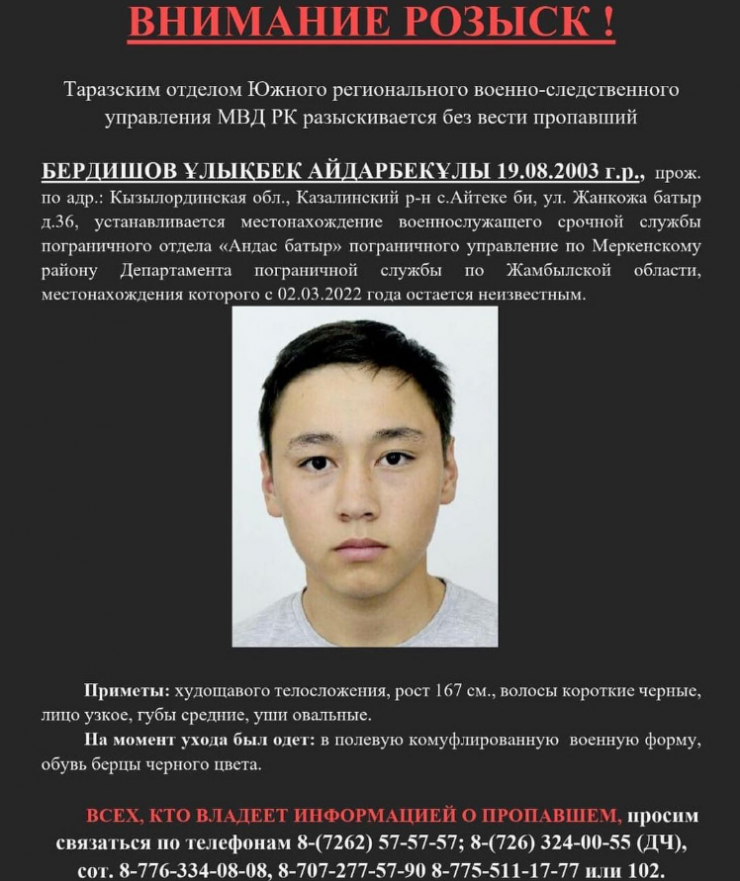Заместитель начальника Департамента Пограничной службы КНБ по Жамбылской области полковник Кайрат Туяков отметил, что Улыкбек Бердишов пропал 2 марта 2022 года во время проведения хозяйственных работ.