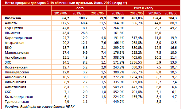 Объем нетто-продаж долларов США за июнь 2019 года составил рекордные 384,2 миллиарда тенге, то есть практически 1 миллиард в долларовом эквиваленте. Это в два раза больше, чем в прошлом месяце, и почти в пять раз больше по сравнению с июнем 2018 года. При этом пиковым значением в прошлом году был август, с объемом всего в 244,6 миллиарда тенге.