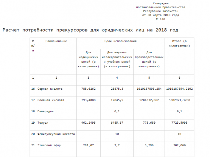 Согласно данным документа, юрлицам Казахстана потребуется около миллиарда килограммов серной кислоты для производственных целей. Для медицины - 785, а для научно-исследовательских и учебных целей - 28 875,3 килограмма.