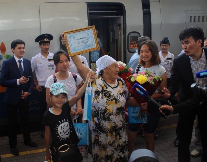 Юбилейным пассажиром стала пенсионерка Канымай Бекбауова, прибывшая в столицу из Актобе с тремя внуками. Ей вручили сертификат с правом на 10 поездок до конца года в любом направлении внутри страны в поездах "Тұлпар-Тальго".