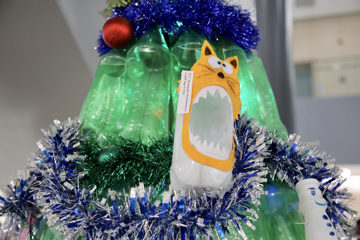 В рамках акции, которая прошла в стенах Международного центра зеленых технологий, была торжественно зажжена эко-елка. На создание столь необычной ели потребовалось порядка 250 единиц использованной пластиковой тары одинаковых цвета и размера.