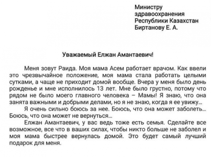Министр здравоохранения Казахстана Елжан Биртанов на своей странице в Facebook ответил на разошедшееся в соцсетях письмо 13-летней девочки Раиды, чья мама работает врачом.