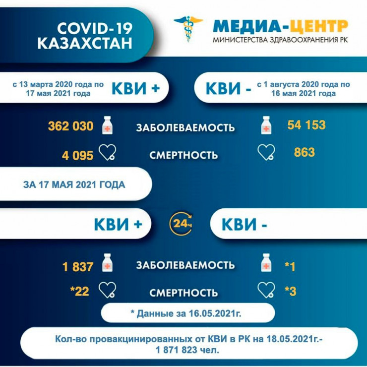 "По официальным данным Бюро национальной статистики Агентства по стратегическому планированию и реформам и Министерства здравоохранения, количество умерших от КВИ по итогам 2020 года составило 4 729 человек. Анализ смертности по оперативным данным МЗ с начала текущего года по настоящее время свидетельствует о том, что количество умерших от КВИ составило 2 123 человека, из них от КВИ "+" - 1 766 человек, КВИ "-" - 357 человек", - сообщили корреспонденту в пресс-службе ведомства.