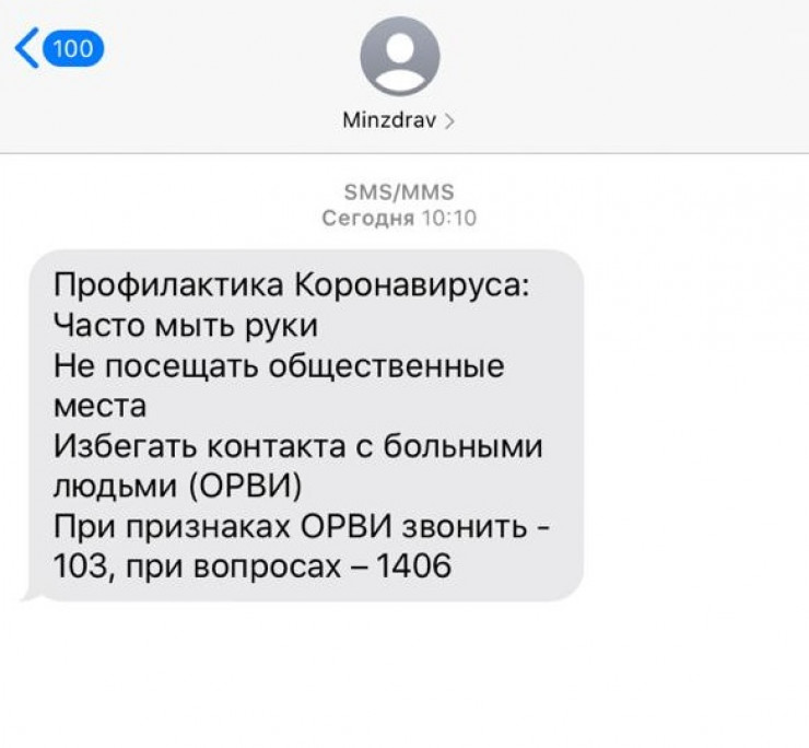 В сообщении содержатся инструкция о правилах личной гигиены и основные рекомендации для борьбы с коронавирусом. "Профилактика коронавируса: часто мыть руки, не посещать общественные места, избегать контакта с больными людьми (ОРВИ). При признаках ОРВИ звонить - 103, при вопросах - 1406", - говорится в первой SMS-рассылке Минздрава.