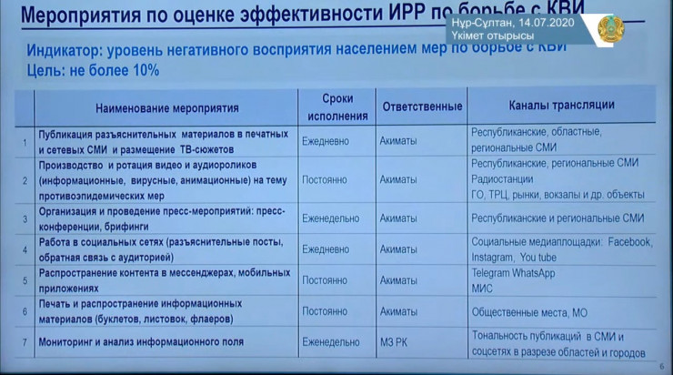 "По новому показателю, который показывает оценку эффективности информационно-разъяснительной работы по борьбе с COVID-19, должны быть реализованы мероприятия, которые должны повысить уровень осведомленности населения при проводимых мероприятиях", - заявил на заседании правительства министр здравоохранения Алексей Цой.