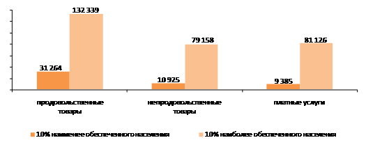 Отмечается, что уровень потребительских расходов домашних хозяйств напрямую зависит от их материальной обеспеченности, а расходы домохозяйств как и доходы, показывают значительную разницу. Так, во втором квартале 2017 года разница в расходах на продовольственные товары между наименее и наиболее обеспеченным населением составила 4,2 раза, на непродовольственные товары - 7,2 раза, а на платные услуги - 8,6 раза.