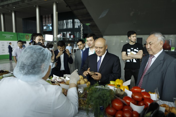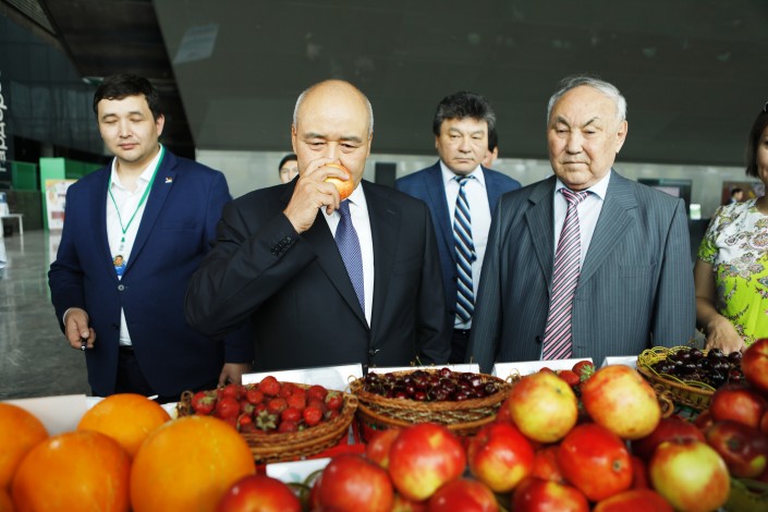 В холле киноконцертного зала расположилась сельскохозяйственная выставка. Производители из разных регионов страны представляли свою продукцию заместителю премьер-министра - министру сельского хозяйства Умирзаку Шукееву и даже предлагали ее попробовать.