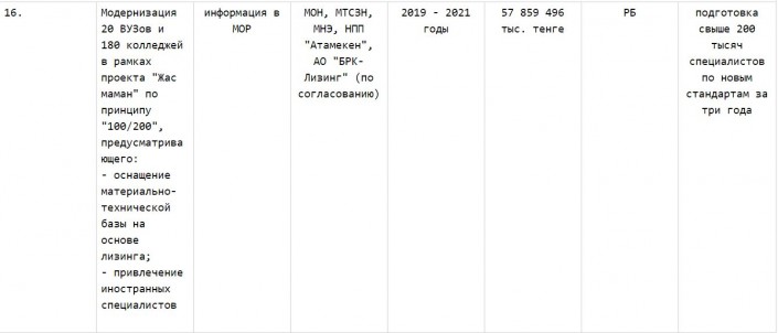 Ранее Президент Казахстана Нурсултан Назарбаев поручил создать программу "Жас маман" для подготовки специалистов по 100 востребованным профессиям.