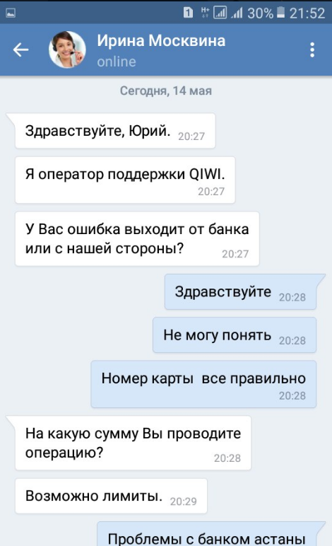 В частности, клиенты Банка Астаны поделились фрагментами переписки, из которой видно, что мошенники выдавали себя за службу поддержки QIWI.