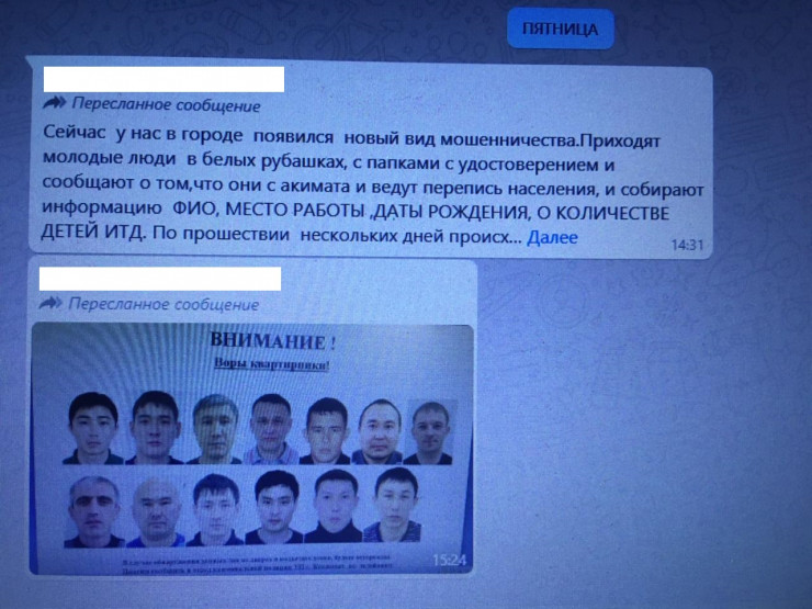"Сейчас у нас в городе появился новый вид мошенничества. Приходят молодые люди в белых рубашках, с папками, с удостоверением и сообщают о том, что они из акимата и ведут перепись населения. Собирают информацию: Ф. И. О., место работы, дата рождения, количество детей и так далее. По прошествии нескольких дней происходит воровство в этих домах. Когда у этих людей требуешь удостоверение, они показывают, но в руки не дают и фотографировать не разрешают. А когда говоришь им, что сейчас позвонишь в акимат или участковому, то они очень быстро уходят", - сообщается в рассылке.
