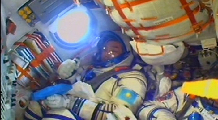 Айдын Аимбетов после старта. Кадр из трансляции "Роскосмоса"