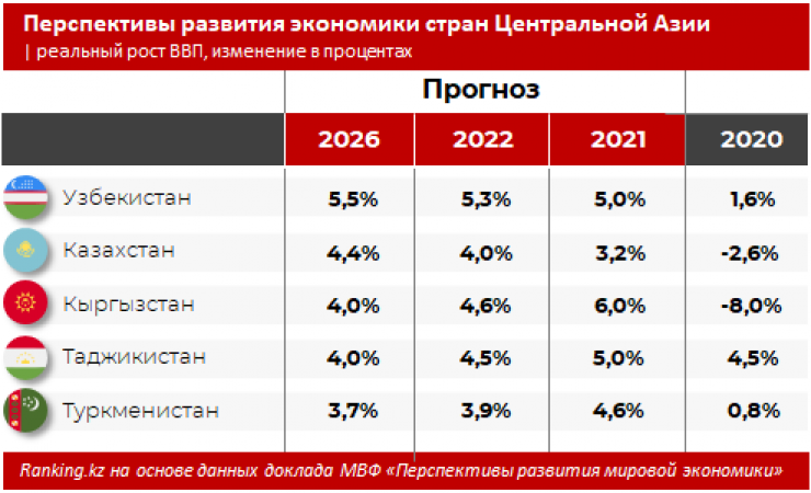 В 2022 году прогрессирующий рост ВВП прогнозируется у Узбекистана (до 5,3 процента) и Казахстана (до четырех процентов). У остальных стран ЦА, согласно прогнозу МВФ, рост экономики, наоборот, замедлится.