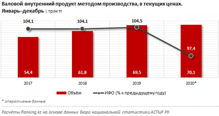 Валовой внутренний продукт (ВВП) в Казахстане, по оперативным данным, за январь – декабрь 2020 года составил 70,1 триллиона тенге - на 2,6 процента меньше, чем за аналогичный период прошлого года, передает Tengrinews.kz со ссылкой на Ranking.kz.