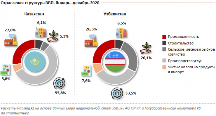 У Узбекистана в отраслевой структуре ВВП за январь - декабрь 2020 года доля услуг составляла чуть более трети, при этом в реальном выражении сектор услуг был в плюсе на 0,1 процента по сравнению с аналогичным периодом 2019 года. Доля промышленности в ВВП составила 26,3 процента (плюс 0,7 процента), сельского, лесного и рыбного хозяйства - 26,1 процента (плюс три процента), строительства - 6,5 процента (плюс 9,2 процента).