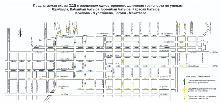 Одностороннее движение вводится по улице Макатаева от Калдаякова до Муканова в западном направлении. По улице Гоголя - от Ауэзова до Калдаякова в восточном направлении.