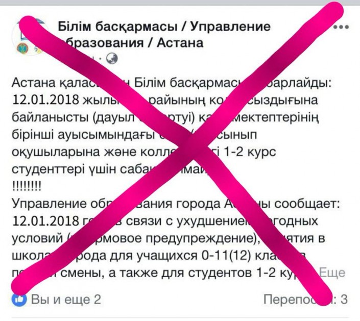 23.20 В Сети распространили заведомо ложную информацию об отмене занятий в школах Астаны 12 января. Об этом сообщил начальник Управления образования Астаны Ануар Жангозин на своей странице в Facebook.