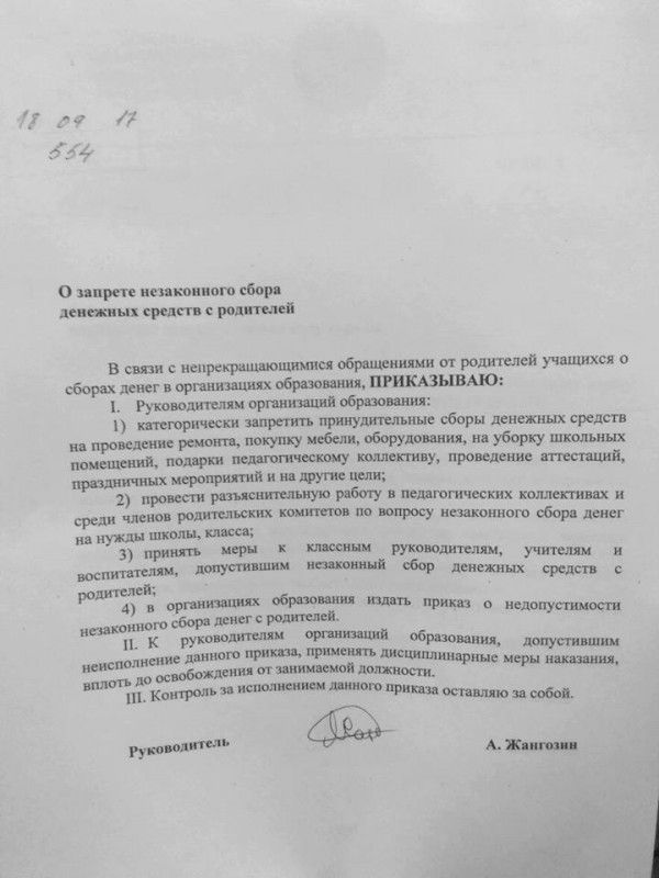 В приказе отмечено, что за сбор денег учителей могут уволить. Подобные меры вызваны "непрекращающимися обращениями от родителей учащихся о сборе денег в организациях образования".