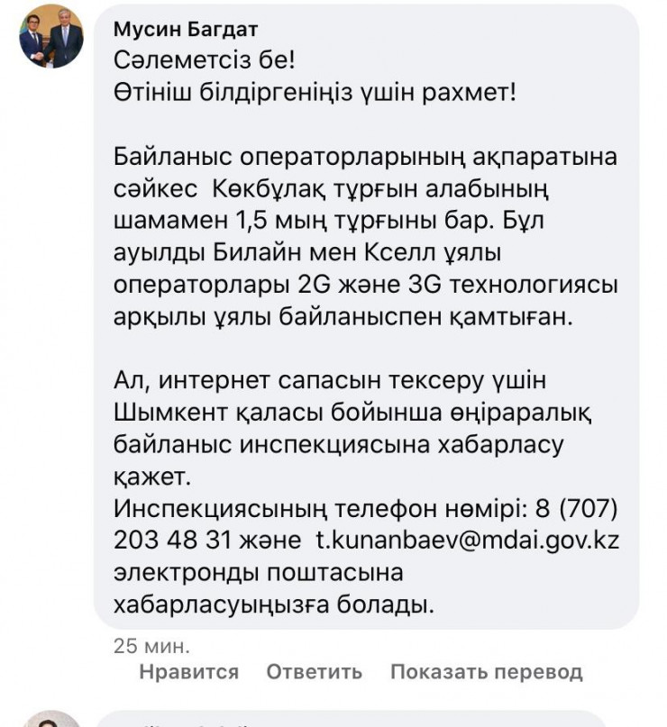 Для проведения проверки качества Интернета вам необходимо написать заявление в Межрегиональную инспекцию по городу Шымкенту. Контакты инспекции: 8 (707) 203 48 31, и также можно обратиться по электронной почте t.kunanbaev@mdai.gov.kz", - написал Багдат Мусин.