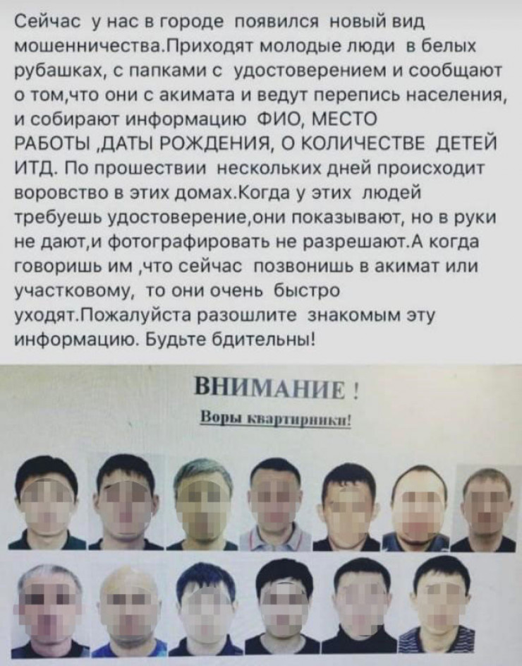 "В городе появился новый вид мошенничества. Приходят молодые люди в белых рубашках, с папками, с удостоверением и сообщают, что они из акимата и ведут перепись населения. Cобирают информацию, а именно Ф.И.О., место работы, количество детей. По происшествии нескольких дней происходит воровство в этих домах", - говорится в рассылке.