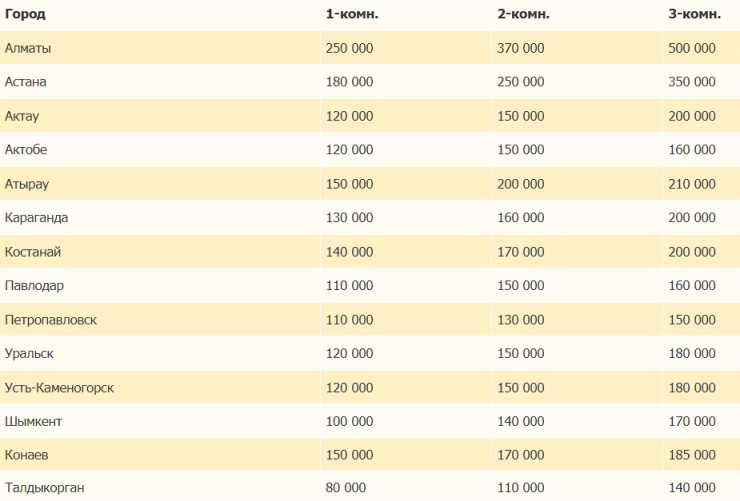 На 24 ноября средние цены на аренду квартир в Казахстане такие: