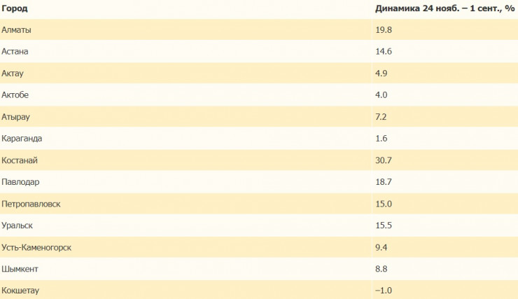 Также сказываются показатели Астаны и Алматы. Здесь разница с доажиотажным периодом плюс 14,6 и 19,8 процента соответственно.
