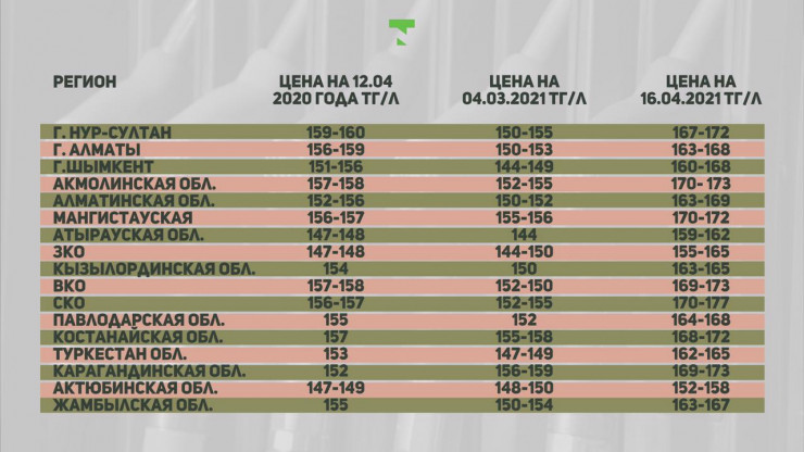 Данные представлены в сравнении, какими цены были в апреле 2020 года и в апреле 2021 года. Это средние показатели по регионам и городам республиканского значения.