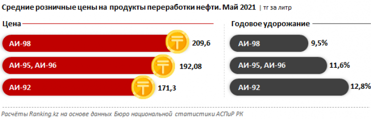 Средние розничные цены на бензин выросли по всем маркам. Так, за год наиболее востребованный бензин АИ-92 вырос в цене к маю 2021 года до 171,3 тенге за литр (+12,8 процента за год). Бензин марки АИ-95/96 подорожал до 192,1 тенге за литр (+11,6 процента), а АИ-95 - до 209,6 тенге за литр (+9,5 процента).