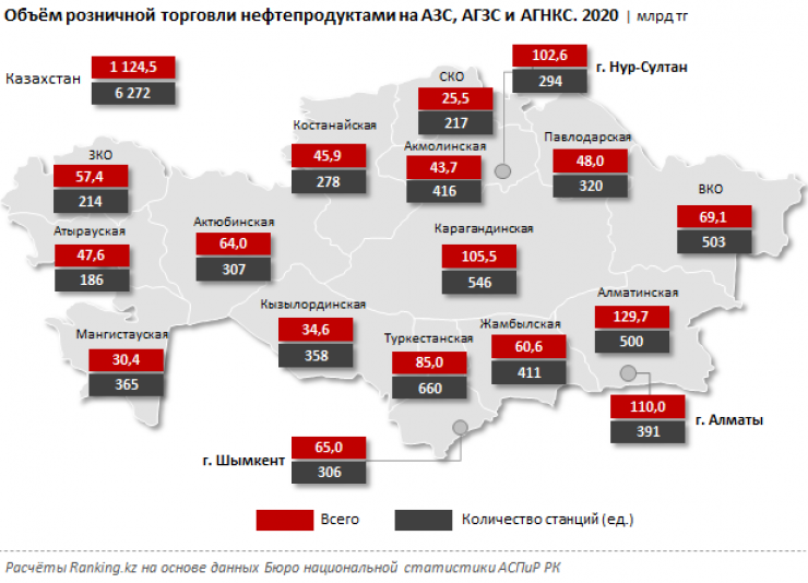 Среди регионов Казахстана наибольшие объемы розничной торговли нефтепродуктами на АЗС, АГЗС и АГНКС в 2020 году пришлись на Алматинскую область (129,7 миллиарда тенге), город Алматы (110 миллиардов тенге) и Карагандинскую область (105,5 миллиарда тенге).