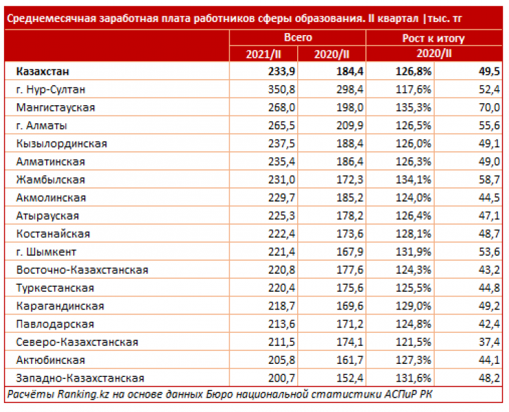 Больше всех зарабатывают учителя и преподаватели столицы - в среднем 350,8 тысячи тенге. На второй и третьей строчках Мангистауская область (268 тысяч) и Алматы (265 тысяч). Худшие показатели по стране - в Западно-Казахстанской области: 200,7 тысячи тенге.