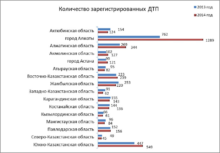 Наибольшее количество ДТП - 1289 - совершено в Алматы, далее следуют Южно-Казахстанская, Алматинская, Восточно-Казахстанская и Жамбылская области, где произошло 549, 344, 239 и 220 автоаварий соответственно.