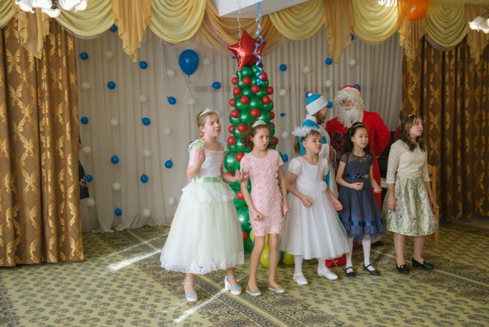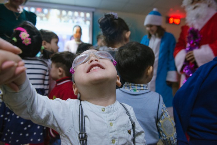Когда мы приехали в коррекционный центр "Дара" для слабовидящих детей, с самого порога сразу стало понятно, куда нас привез автобус. Обычно в детских садах или в школах при виде гостей дети выбегают навстречу, особенно если это Дед Мороз со Снегурочкой. Тут же дети стояли за ручки с мамами и воспитателями, им сказали, кто к ним пришел, они звали сказочного персонажа, но большинство из них даже не имели представления, как он выглядит.