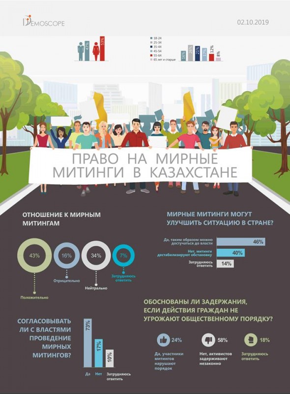 Сотрудники Demoscope провели опрос граждан на тему "Право на мирные митинги в Казахстане". Всего с 26 по 29 сентября 2019 года было опрошено 1100 человек в 14 областях и городах республиканского значения (Нур-Султан, Алматы, Шымкент). Опрос проводился путем звонков на стационарные номера.