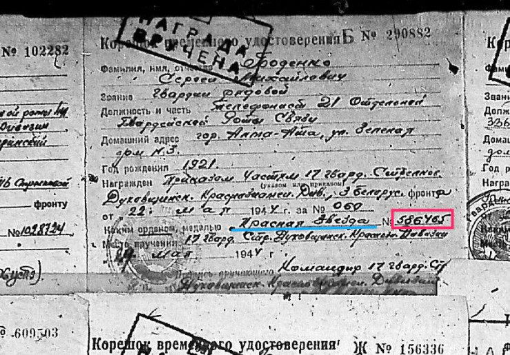 "Командир литовского поискового отряда Baltika Иван Желтобрюх совместно с руководителем латвийской поисковой организации "Патриот" Александром Борисовым установили обладателя ордена Красной Звезды за номером 586465, который нашли во время поисковых работ. Правительственная награда была вручена гвардии рядовому алматинцу Сергею Михайловичу Боденко. Наши прибалтийские друзья попросили разыскать родных погибшего", - рассказал командир павлодарского поисково-исследовательского отряда "Майдан жолы" Александр Шитов.