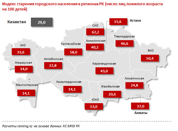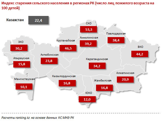 Самые старые села в Казахстане - в СКО, где индекс старения составляет 53,3, в Костанайской области (46,5) и в ВКО (44,2). Наиболее молодые села - в Мангистауской области (чуть больше 10 стариков на 100 детей), ЮКО (12) и Атырауской области (15,8).