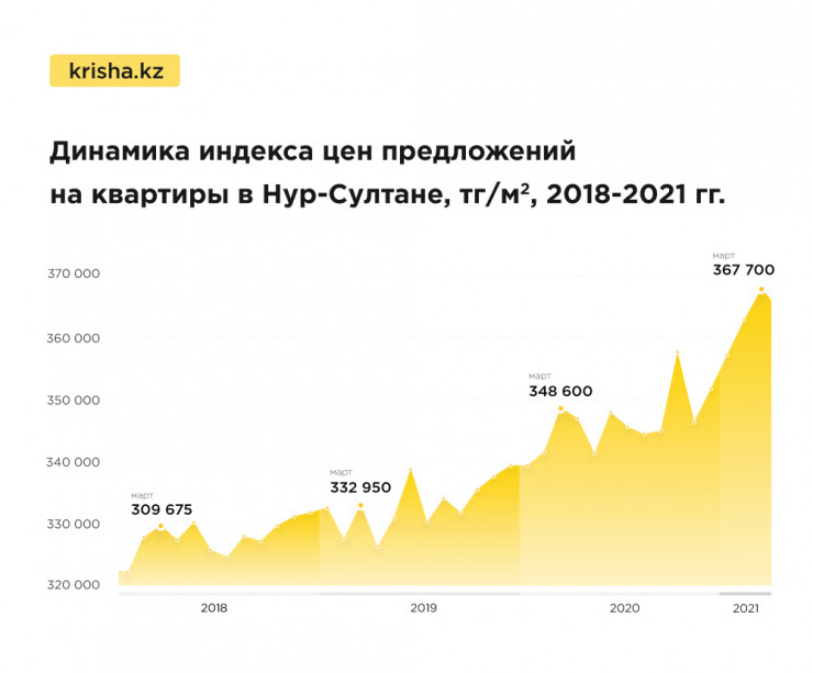В марте 2021 года квадратный метр выставляли на продажу по 367 700 тенге, что на 11,5 процента дороже, чем 3 года назад, пишут специалисты.