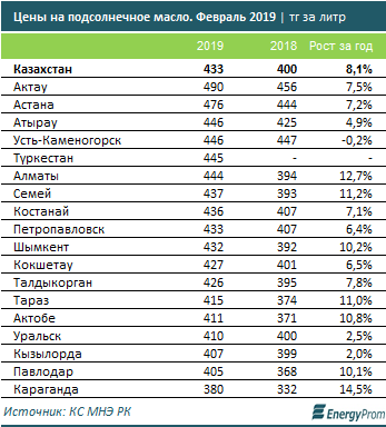 Что касается реализации масла на внутреннем рынке, по итогам 2018 года объемы сократились на 2 процента. К марту 2019 года цены на подсолнечное масло в магазинах и на базарах Казахстана выросли на 8,1 процента за год, до 432,8 тенге за литр.