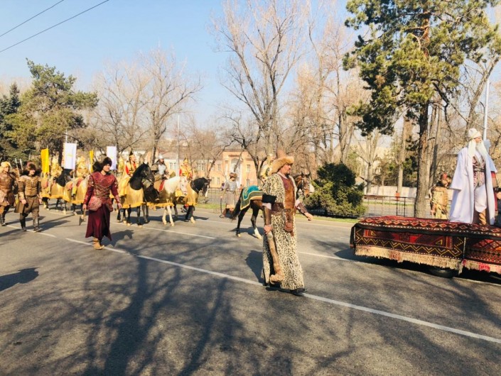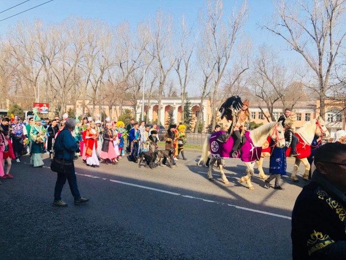 В рядах костюмированного парада, олицетворяющего дух природы, праздник весны и историю казахского народа, приняли участие работники организаций культуры, представители национально-культурных центров, студенты и преподаватели вузов, беркутчи, заводчики казахских тазы, горожане - всего около 2000 человек.