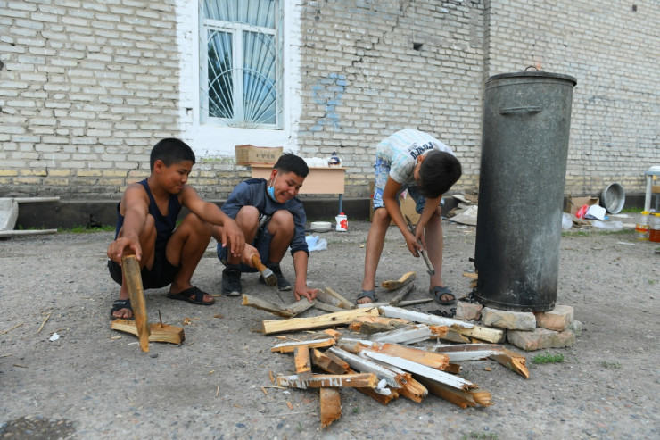 Помогать взрослым вызываются дети и подростки. Пока готовится ужин, они делают кипяток для чая.