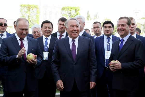 Тогда президент и премьер-министр России получили от Елбасы в подарок сувенирные тарелки, посвященные реконструкции павильона "Казахстан", и корзину с алматинским апортом.