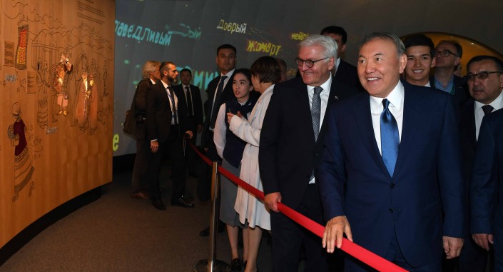 "Здесь лидеры двух стран ознакомились с интерактивными экспозициями, посвященными культуре и истории Казахстана, а также поднялись на восьмой этаж павильона, где расположена экспозиция "Астана будущего". По окончании экскурсии президент ФРГ сделал запись в книге почетных гостей выставки.