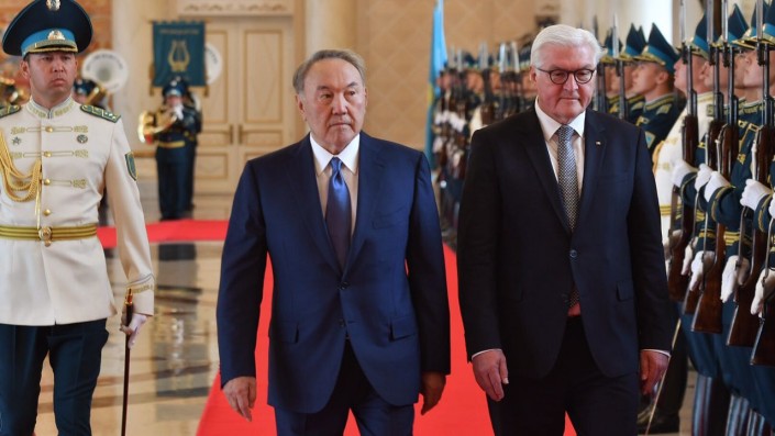 По традиции иностранную делегацию встречали в холле резиденции Президента Казахстана. Нурсултан Назарбаев представил президенту Германии членов казахстанского правительства, после чего Франк-Вальтер Штайнмайер представил Главе государства делегацию из Германии. После этого прозвучали гимны двух стран.